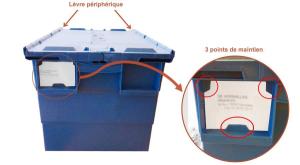 • Ces bacs sont gerbables : une lèvre périphérique maintient en place les bacs supérieurs et évite ainsi que ces derniers glissent pendant le transport.