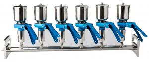 La rampe de filtration à 6 postes, est réalisée en acier inoxydable 316L et la fixation du support filtre se fait par l'intermédiare d'un bouchon en silicone. Elle est étudiée pour la filtration simultanée de plusieurs échantillons.