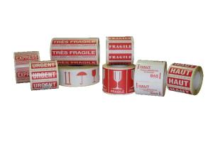 Ecriture blanche sur fond rouge. Présentation en rouleau sur mandrin de 1000 étiquettes.