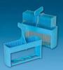 Portoir pour coloration, en acier inoxydable doté de 3 cuves avec couvercles en nylon bleu